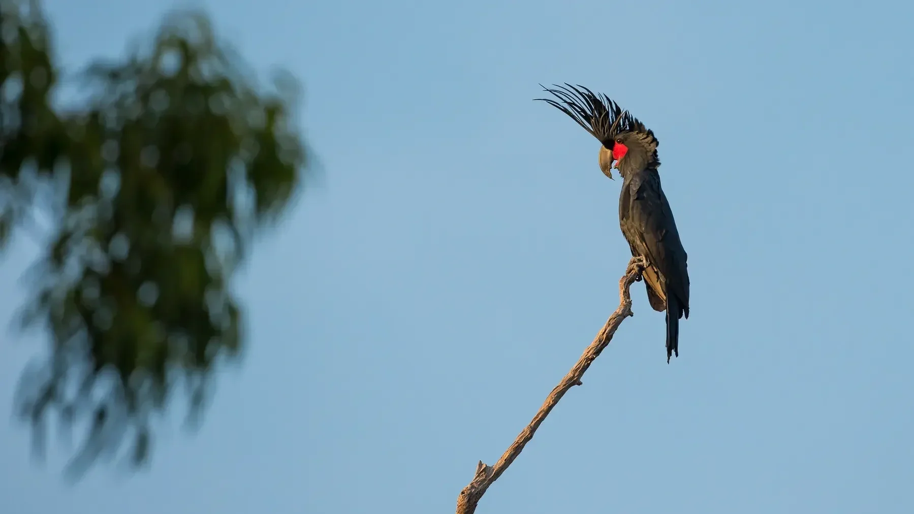 Palm Cockatoos are also the only non-human species known to craft and play a musical instrument. Males snap off branches, shape them into drumsticks, and beat on hollow trees to impress potential mates.